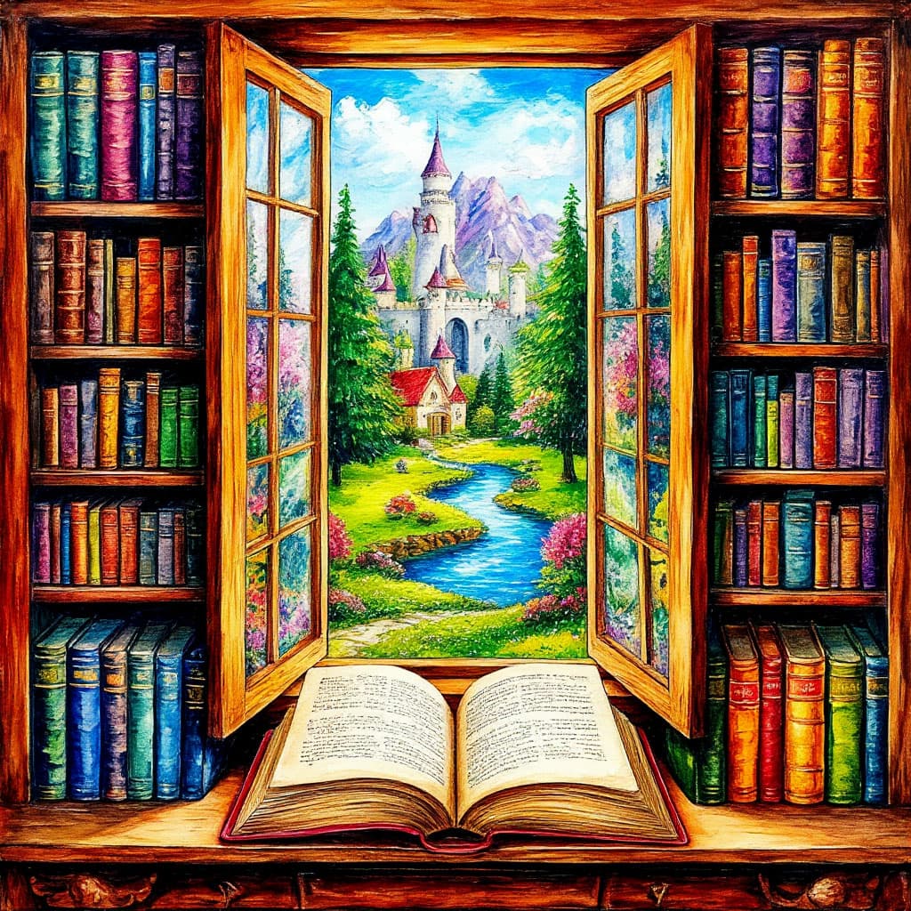 Voici ce que ça donne si on demande tout simplement :« la lecture c’est l’aventure. Dessin aux crayons couleur »
