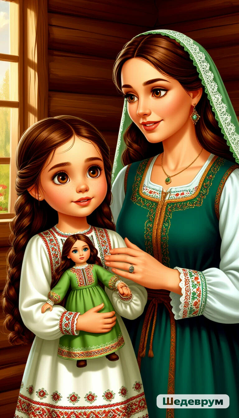 Par exemple, la description détaillée suivante « (une fille de douze ans, robe traditionnelle slave blanche avec des motifs traditionnels, yeux noisette et cheveux bruns). Dans une isba, dans une chambre d’enfant, avec une poupée (robe verte avec broderie dorée, voile vert foncé) dans les mains de la fillette. Une femme, la mère de la fillette, trente ans, est à ses côtés, parle avec la fille, les mains levés (robe bleue traditionnelle avec des motifs, voile, yeux et cheveux bruns, alliance). Illuminé par la lumière du jour. Style dessin animé, avec couleurs vives caractéristiques. » génère cette image