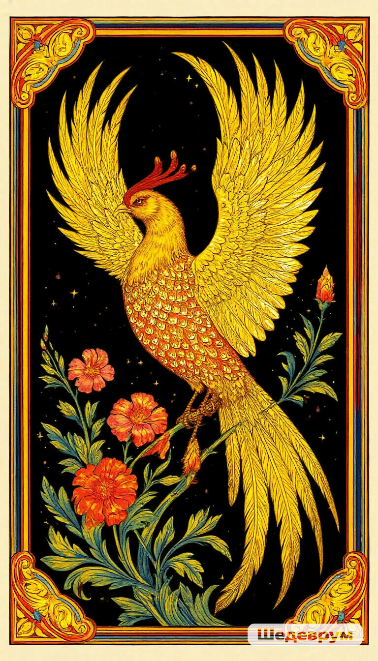 Par exemple, la description suivante « Illustration dans le style d’Ivan Bilibine, avec couleurs vives caractéristiques, de face, Jar-Ptica (plumes en or brillants, scintillants) » génère cette image