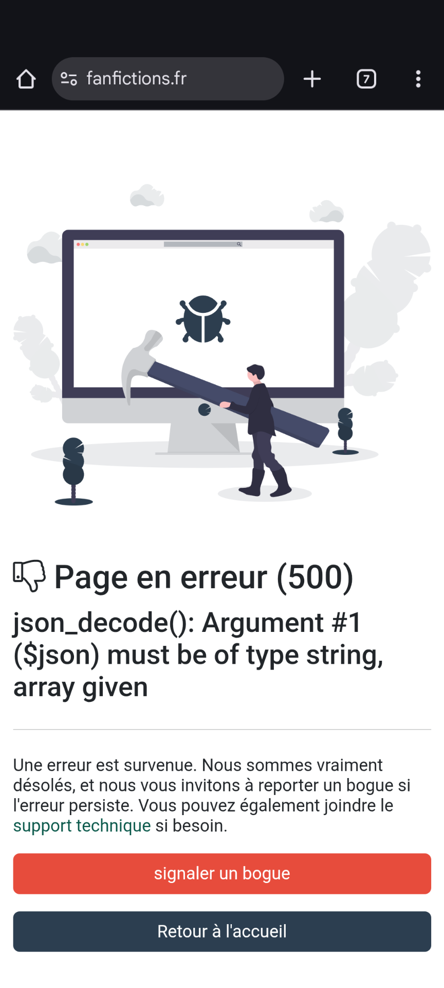 Maintenant, je viens de vérifier et de mon côté, le problème à muter en « Page en erreur (500) ## json_decode(): Argument #1 ($json) must be of type string, array given »