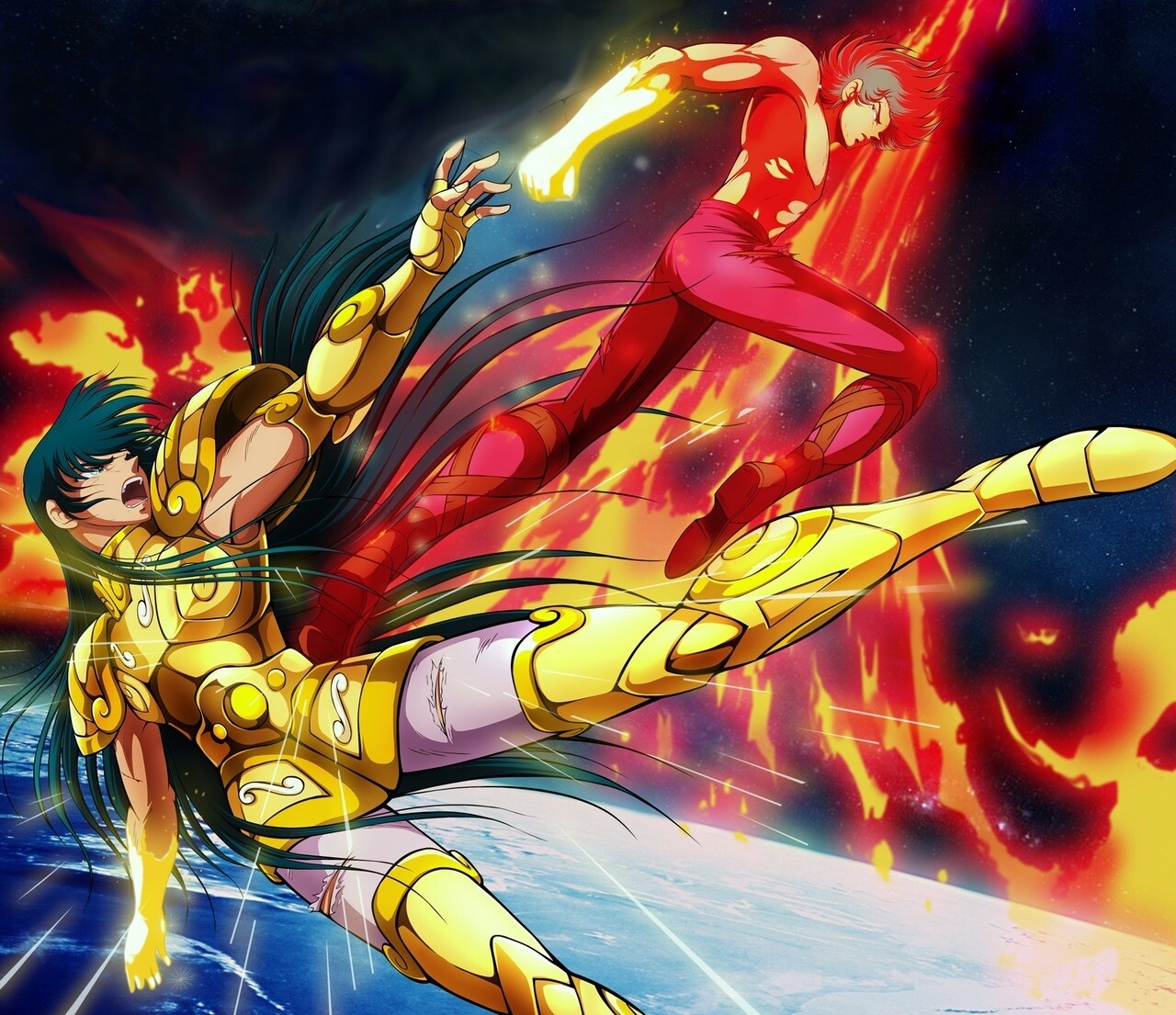 Personnages : Shiryu, chevalier de bronze du Dragon, et Shura, chevalier d’or du Capricorne.