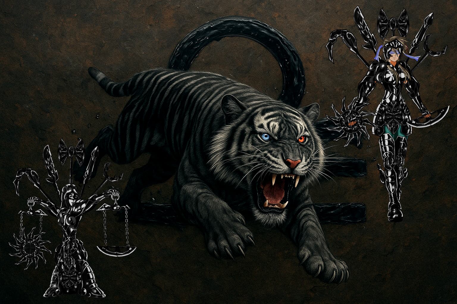 Je viens de pondre ça… le tigre animal emblématique de la Corée (ici stylisé noir aux rayures blanches), le sigle de la Balance, un oeil bleu et l’autre rouge. Ca donne le ton…