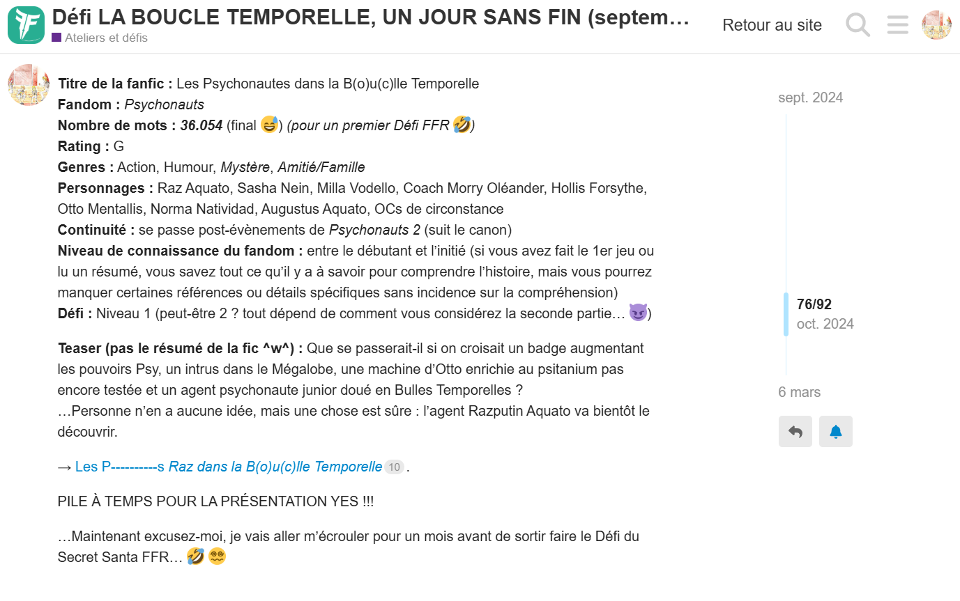 Pour le minimum, c’est connu, c’est 1 500 mots. Et c’est vrai que certains défis ne sont pas évidents pour respecter le minimum de mots