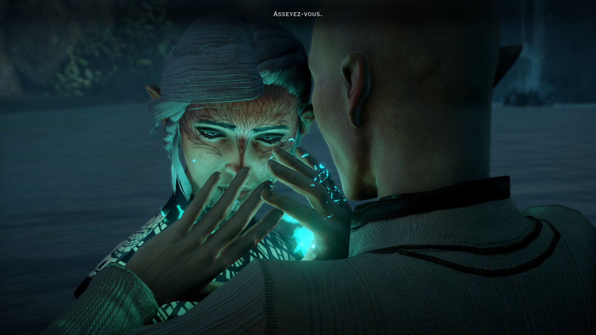 - " Vous êtes unique. Je n’aurais jamais cru trouver quelqu’un dans tout Thédas capable d’attirer mon attention depuis l’immatériel. Vous êtes devenue importante pour moi. Bien plus que vous l’imaginez. Je dois vous dire la vérité, votre visage les Vallaslin. Dans mes voyages dans l’immatériel. J’ai découvert ce que ces marques signifie.