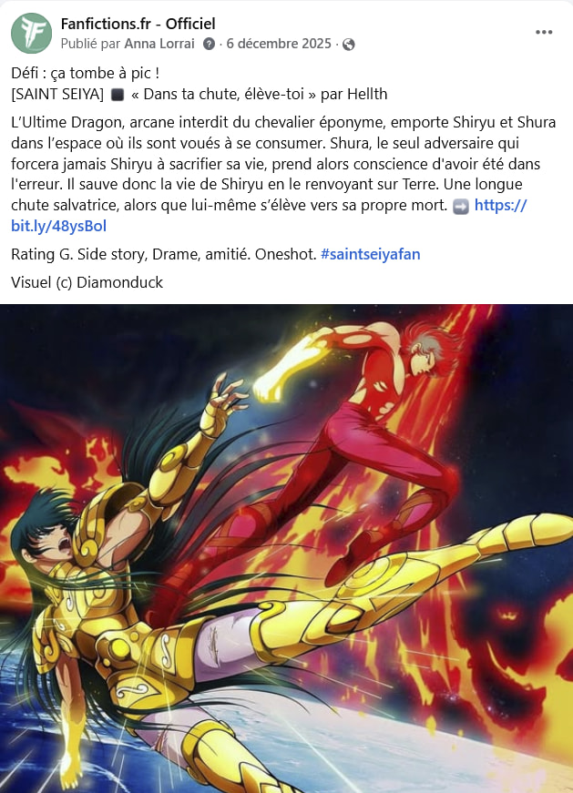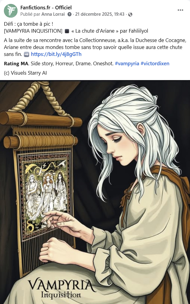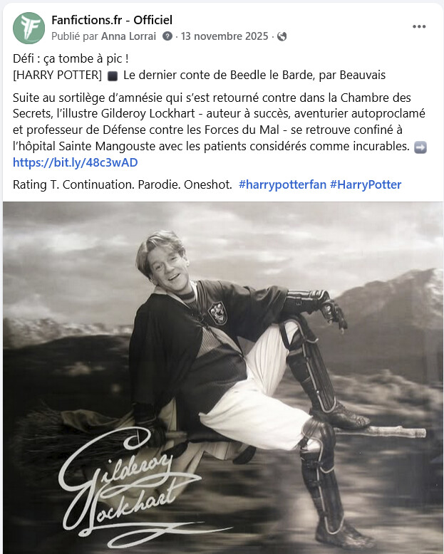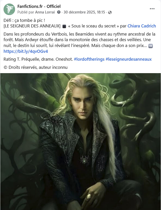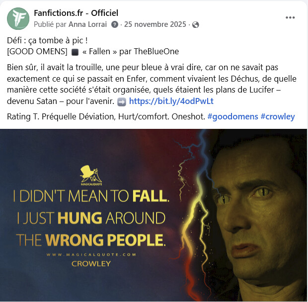 Toutefois, la page Facebook est en réalité « ma » page sur FFR ; elle y est entièrement consacrée, et je m’y dévoue. Ce n’est pas ma page d’auteur par exemple où je ne promouvrais que mes textes. Mais comme j’en suis la seule admin, qu’elle est née d’une initiative entièrement personnelle, eh bien… je la gère comme je l’entends en faisant des arbitrages. Il n’y a pas de gestion collégiale faite par la Team.