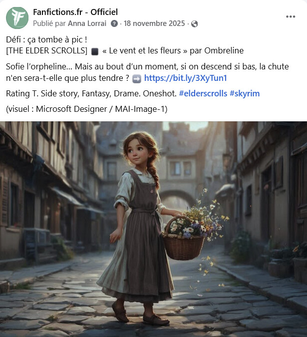 Quand il n’y a pas d’image associée à la parution du Défi, l’image peut être cherchée sur internet en rapport avec le fandom, ou en rapport avec le sujet de la fic. S’il n’y a rien de bien, elle est fabriquée. Anciennement par montage, ou plus fréquemment aujourd’hui par IA (ou IA et montage…).