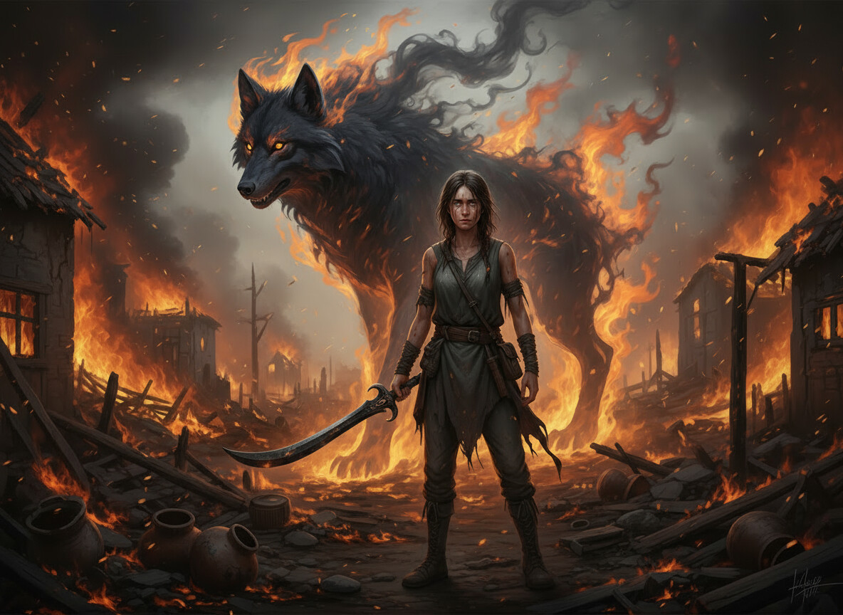 Voici Elyana Mor’Shar, guerrière de l’Île des Lames : totem du loup, talent de combat légendaire… et vie qui part officiellement en flammes (littéralement).