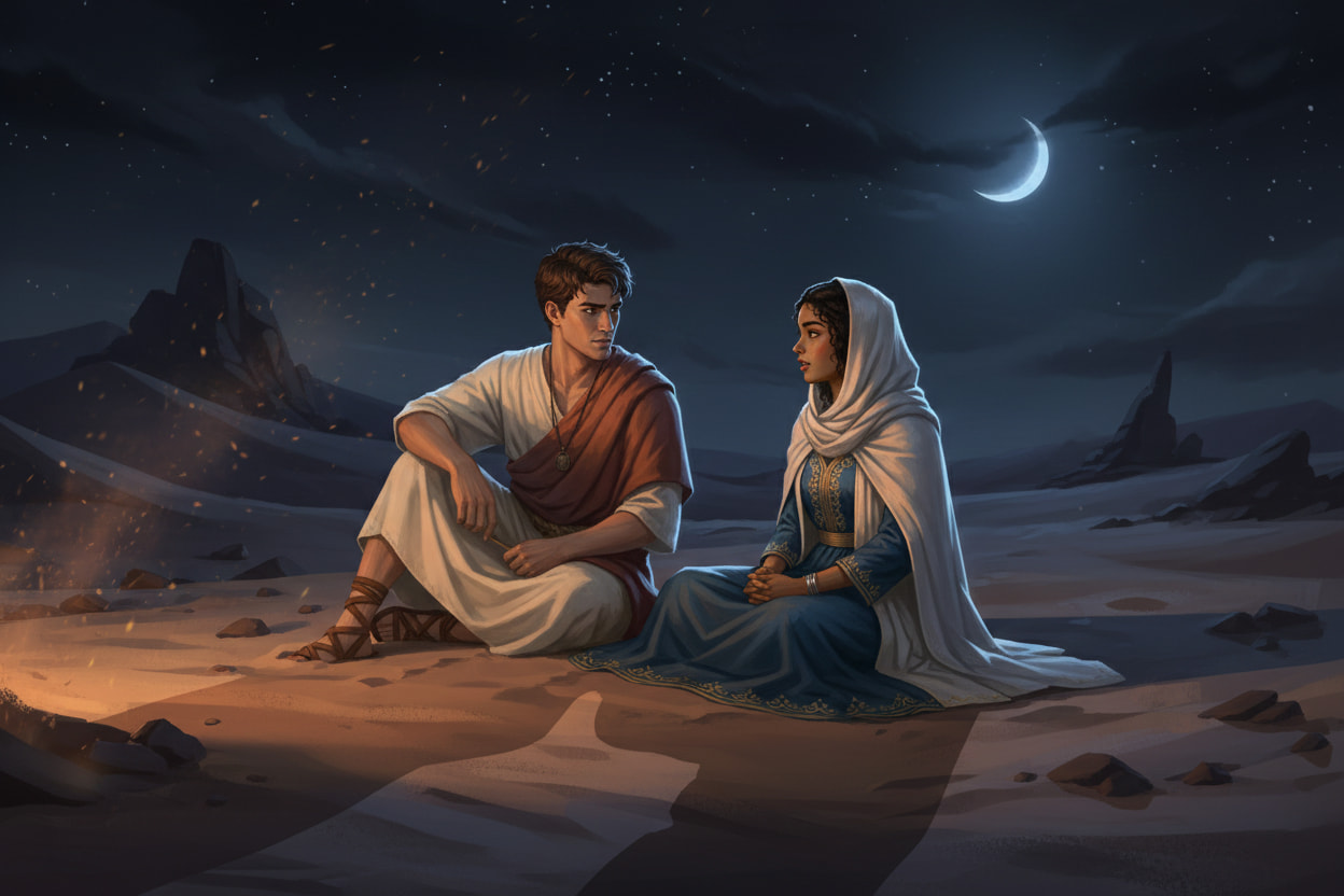 Soleman releva les yeux, puis acquiesça d’un léger mouvement de tête. Elle s’installa près de lui, laissant le silence s’installer un moment. Elle baissa les yeux, pensive. Puis, après un silence, releva la tête et, avec une sincérité rare, lâcha :