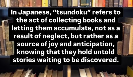 ( En japonais, « tsundoku » désigne l’acte de collectionner des livres et de les laisser s’accumuler, non pas par négligence, mais plutôt comme une source de joie et d’anticipation, sachant qu’ils détiennent des histoires inédites qui attendent d’être découvertes)