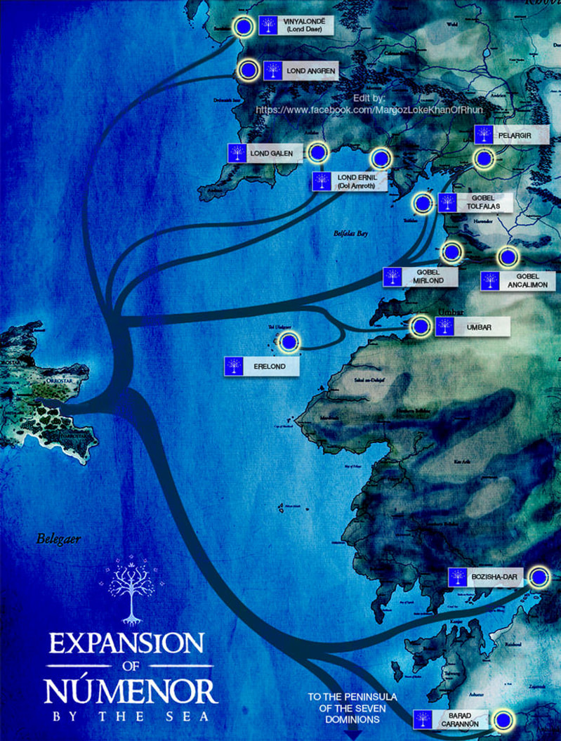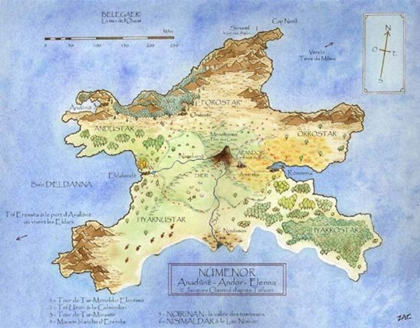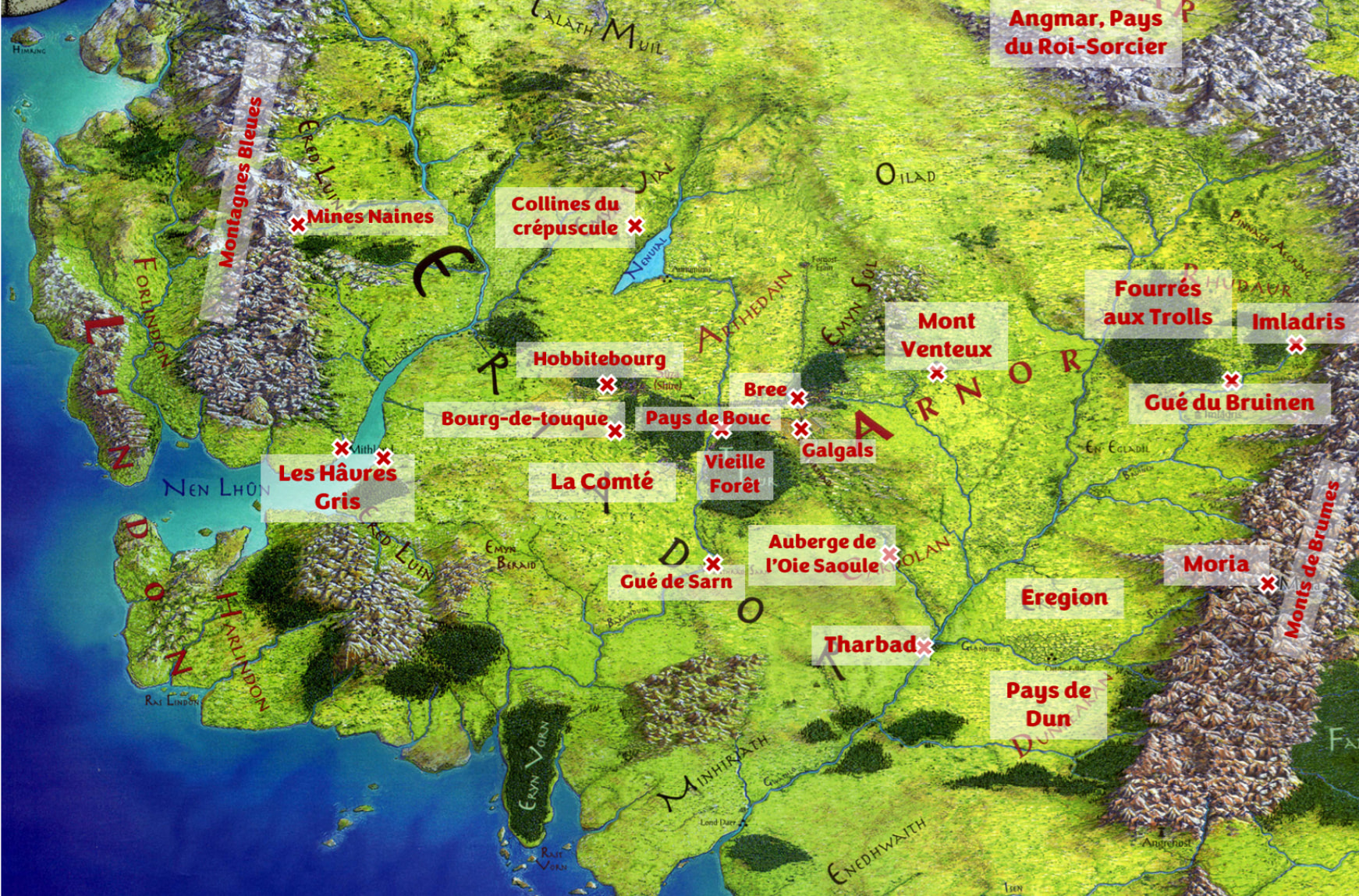 Nota Bene : Eriador est le nom de toute la région comprise entre les Montagnes Bleues (à l’ouest) et les Monts de Brumes (à l’est). C’est une notion géographique. Tandis que Arnor, et son morcellement ultérieur en Arthedain, Cardolan et Rhudaur, sont des notions politiques, des noms de royaumes. Quant à Eregion, c’est une région (Sindarin “Pays du houx”), qui fut aussi un royaume du maître-forgeron elfe Celebrimbor au 2nd âge.)