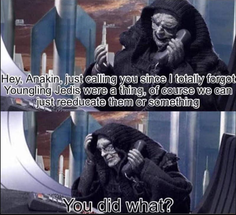 « Hey, Anakin, je t’appelais juste parce que j’ai complètement oublié de te parler des Padawans, bien-sûr on peut juste les rééduquer ou quelque chose dans le genre »