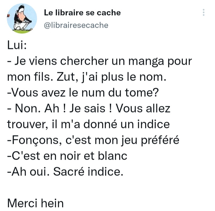 Ahahah, malheureusement, c’est le quotidien de mes collègues libraire : « bonjour, je recherche un livre. Je n’ai ni le titre, ni l’auteur, mais la couverture est bleu »