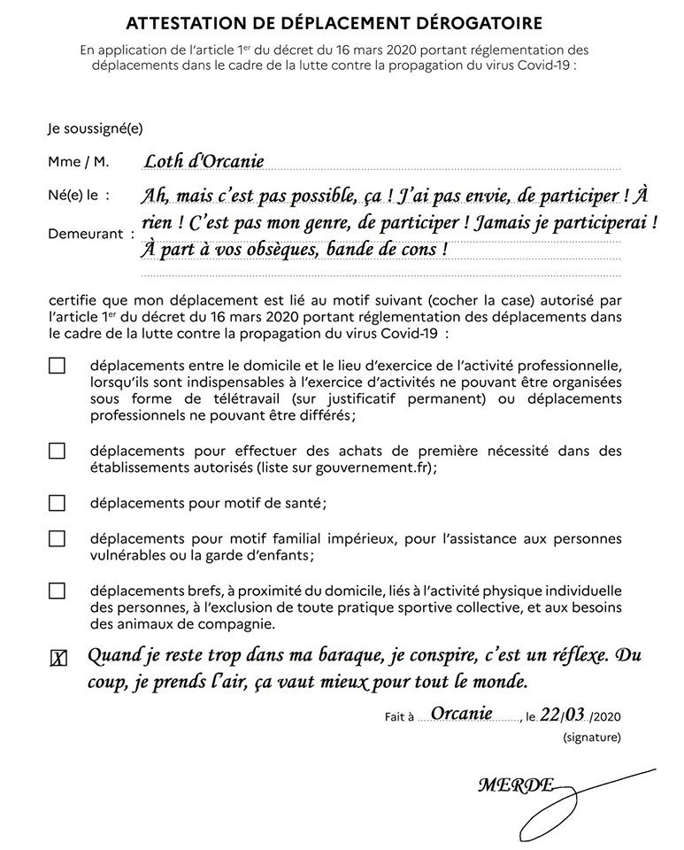 Et sinon, pour rebondir sur la signature de cette magnifique attestation… « Moi, en général, je réponds mer-de, en principe ça colle avec tout. »