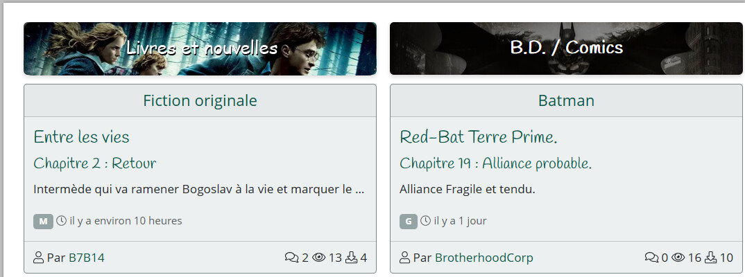 Wahoo ! Rudement chouette la nouvelle page d’accueil du site ! Tout bien classé, et du coup ça fait plus de nouveautés à voir (carrément on passe de 10 à 30). Reste à tester la section « Fanfictions recommandées » ![]()