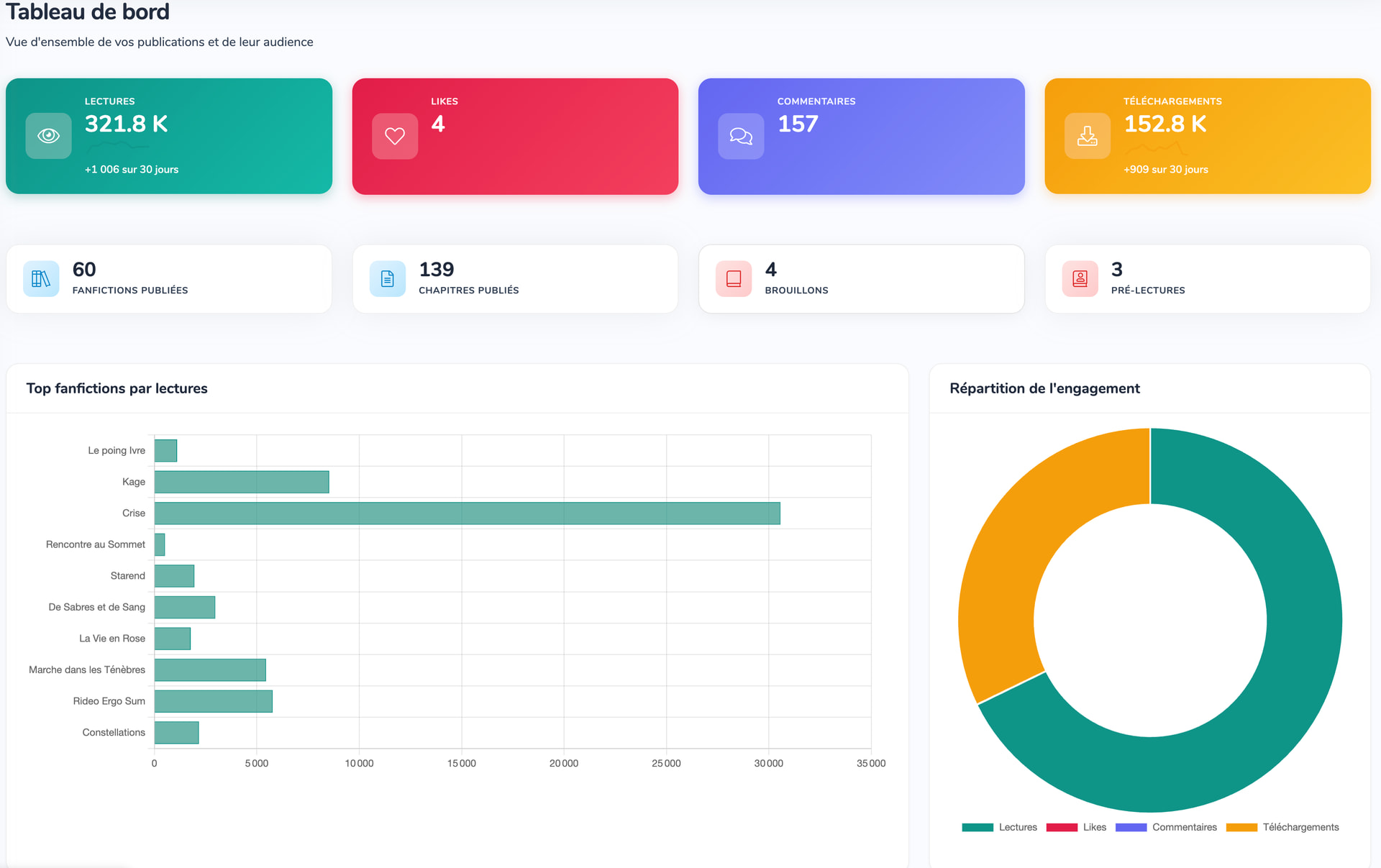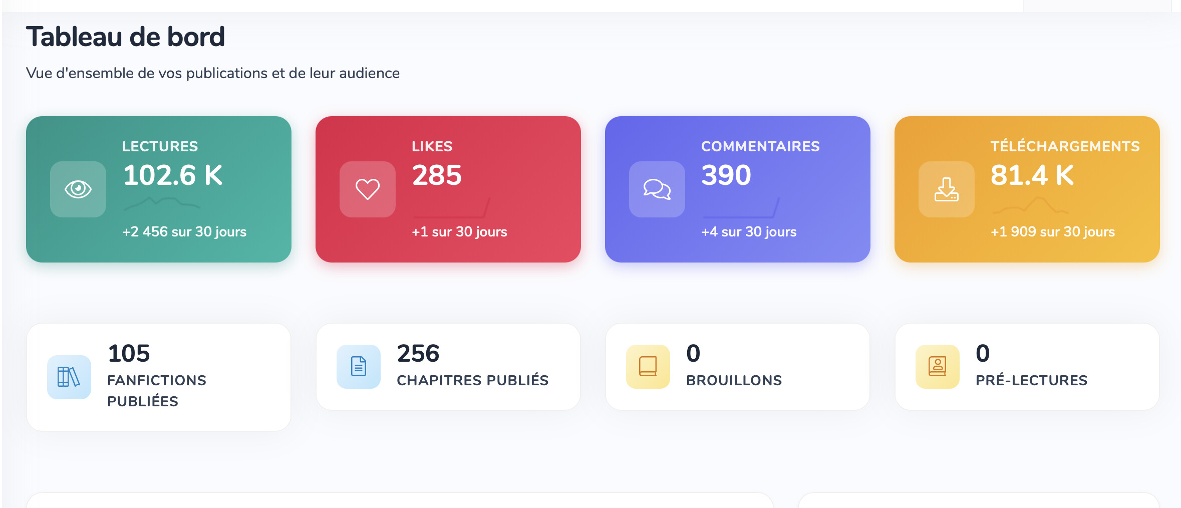 Dans votre tableau de bord personnel, vous pouvez désormais profiter de nouveaux graphiques et statistiques pour avoir plus de détails sur le succès de vos fanfictions.