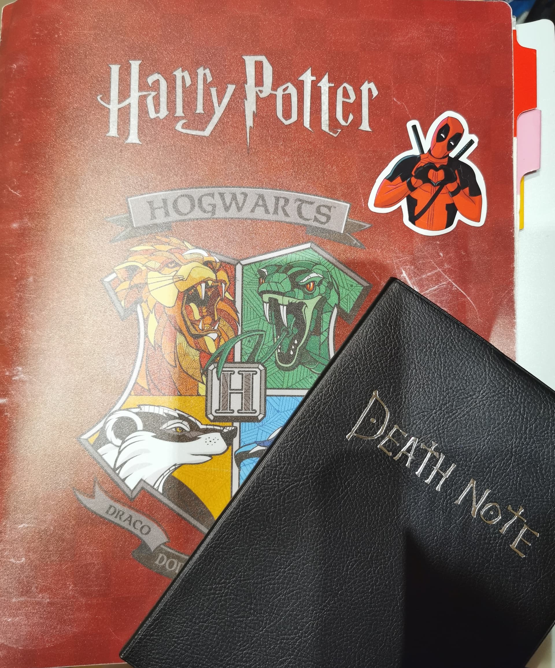 Le Death Note, Deadpool et le logo Poudlard… sympa, pas sympa je ne sais pas, mais ça tombe dans la catégorie prof cool à mes yeux