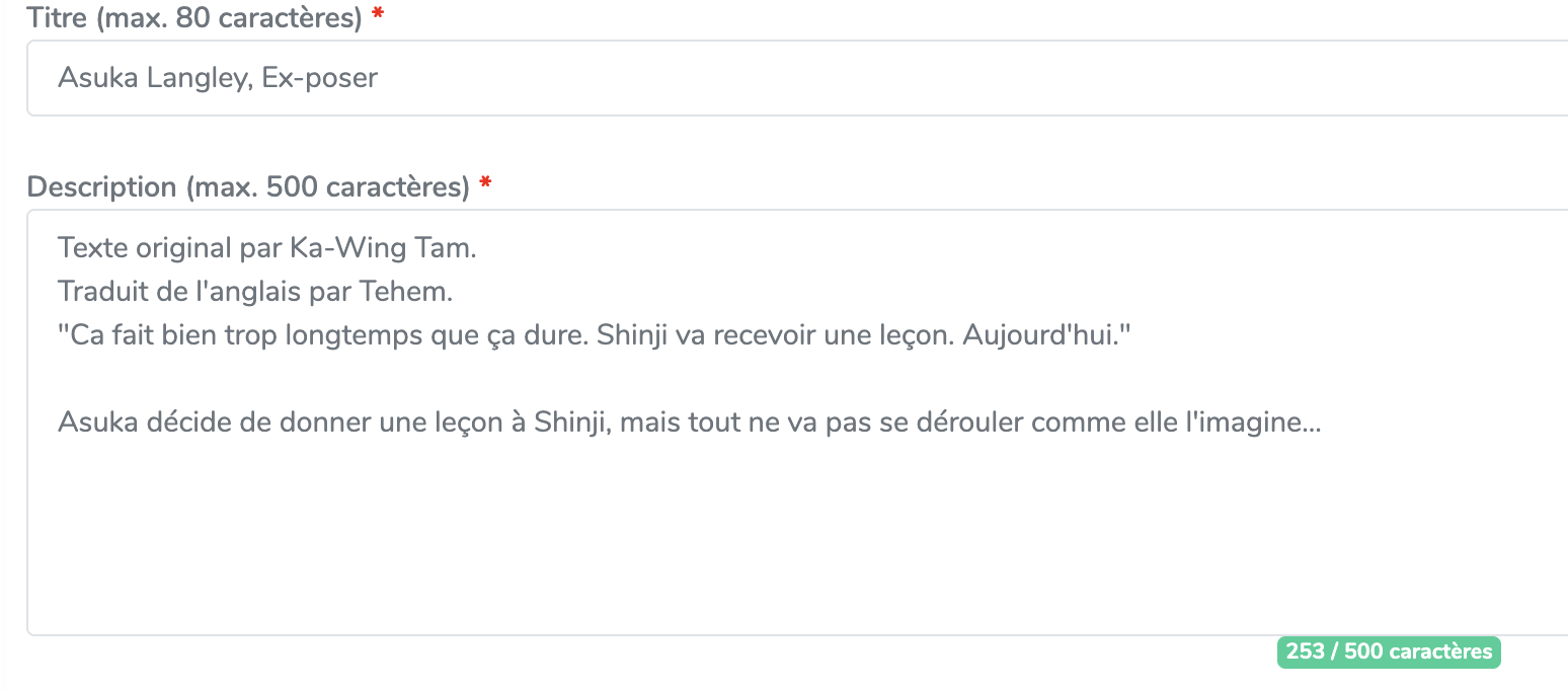 Une petite mise à jour avec l’ajout de compteurs de caractères sur les pages de création de fanfictions et de chapitres, c’était une demande remontée sur le site des suggestions ici.
