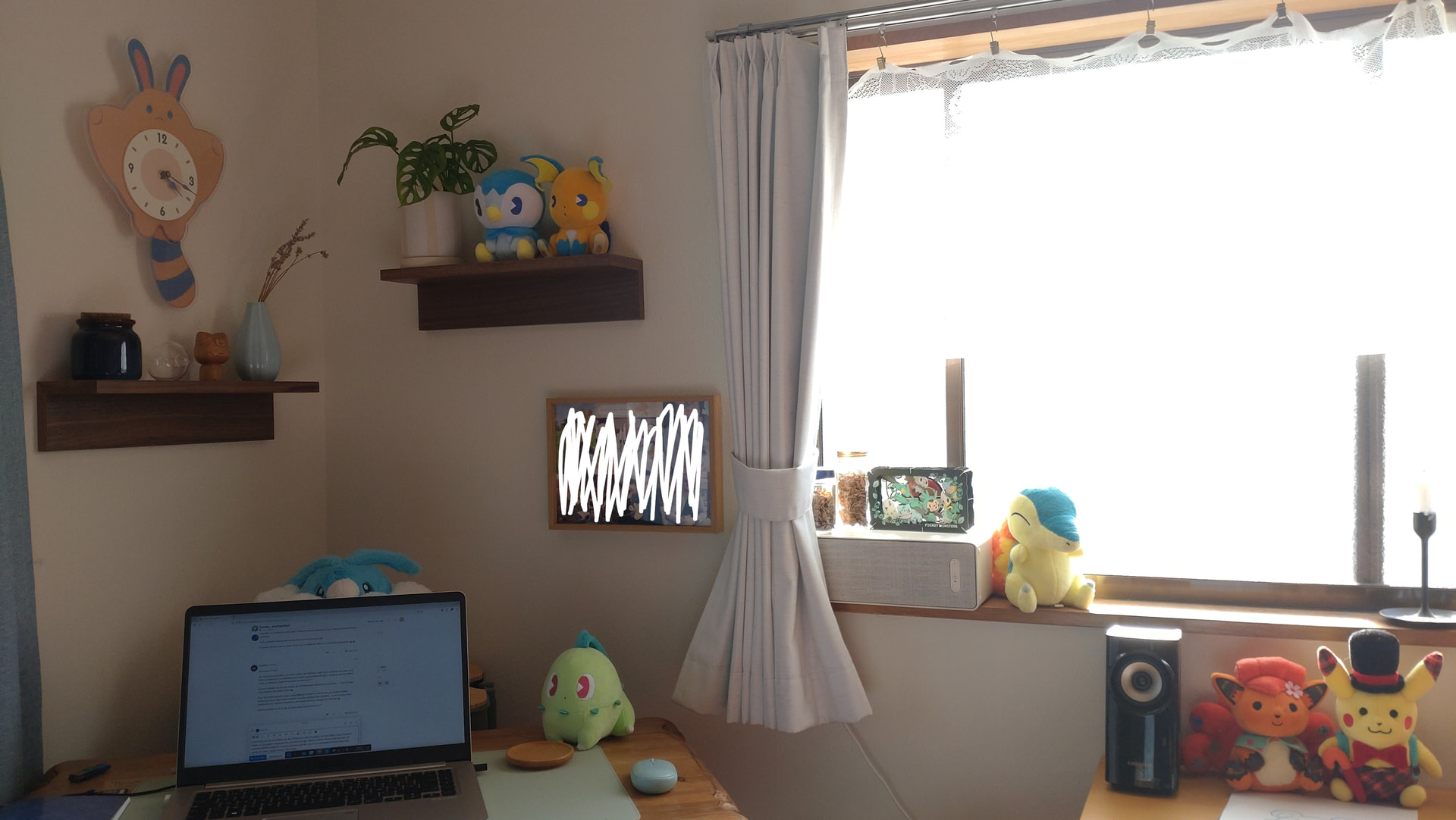 C’est-à-dire que là on partirait sur des clichés de toutes les pièces de ma maison, sous plusieurs angles, à l’exception seulement de ma cuisine et des toilettes (même dans la salle de bain, j’ai quelques textiles pokémon, pas de peluches cela dit). xD J’en ai présentément sept dans mon champ de vision, assise devant mon écran. Ce n’est qu’un fragment de la situation. Il y en a encore sept autres derrière moi… et ce n’est qu’une pièce de la maison.