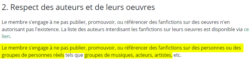 Vous imaginez donc sans peine ma question : ma fanfic est-elle publiable sur ce site ? Si je m’en tiens au strict règlement, je me doute bien que la réponse sera non, mais comme j’ai très envie de la mettre ici, je tente le coup. Dans le règlement, il est indiqué « fiction portant sur une personne réelle »… je me suis dit que peut-être, si les personnages principaux étaient fictifs, ça pouvait passer.