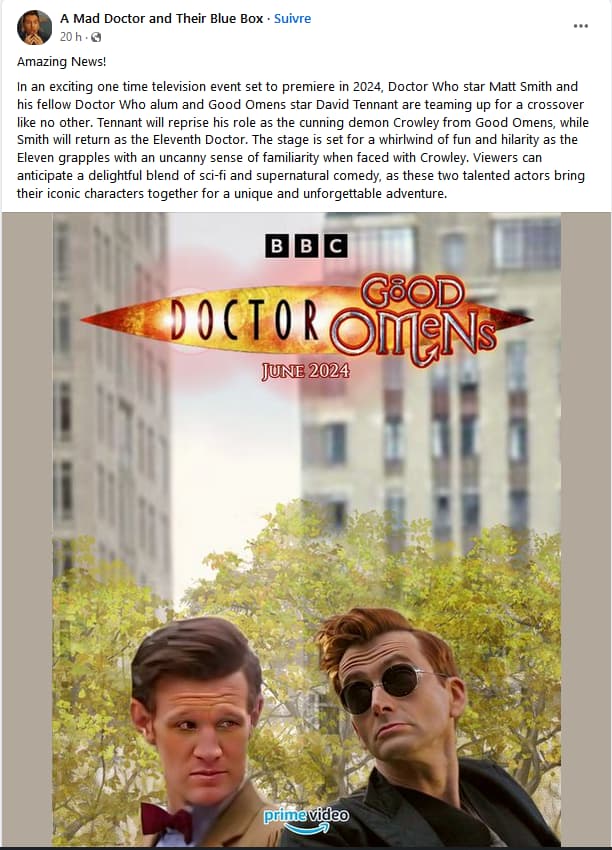 Dans le cadre d’un événement télévisuel exceptionnel dont la première aura lieu en 2024, Matt Smith, star de Doctor Who, et David Tennant, ancien de Doctor Who et star de Good Omens, feront équipe pour un crossover sans précédent. Tennant reprendra son rôle de Crowley, le démon rusé de Good Omens, tandis que Smith reviendra en tant que Onzième Docteur. Le décor est planté pour un tourbillon de plaisir et de rire alors que Onze est aux prises avec un étrange sentiment de familiarité lorsqu’il est confronté à Crowley. Les téléspectateurs peuvent s’attendre à un délicieux mélange de science-fiction et de comédie surnaturelle, ces deux acteurs talentueux réunissant leurs personnages emblématiques pour une aventure unique et inoubliable.