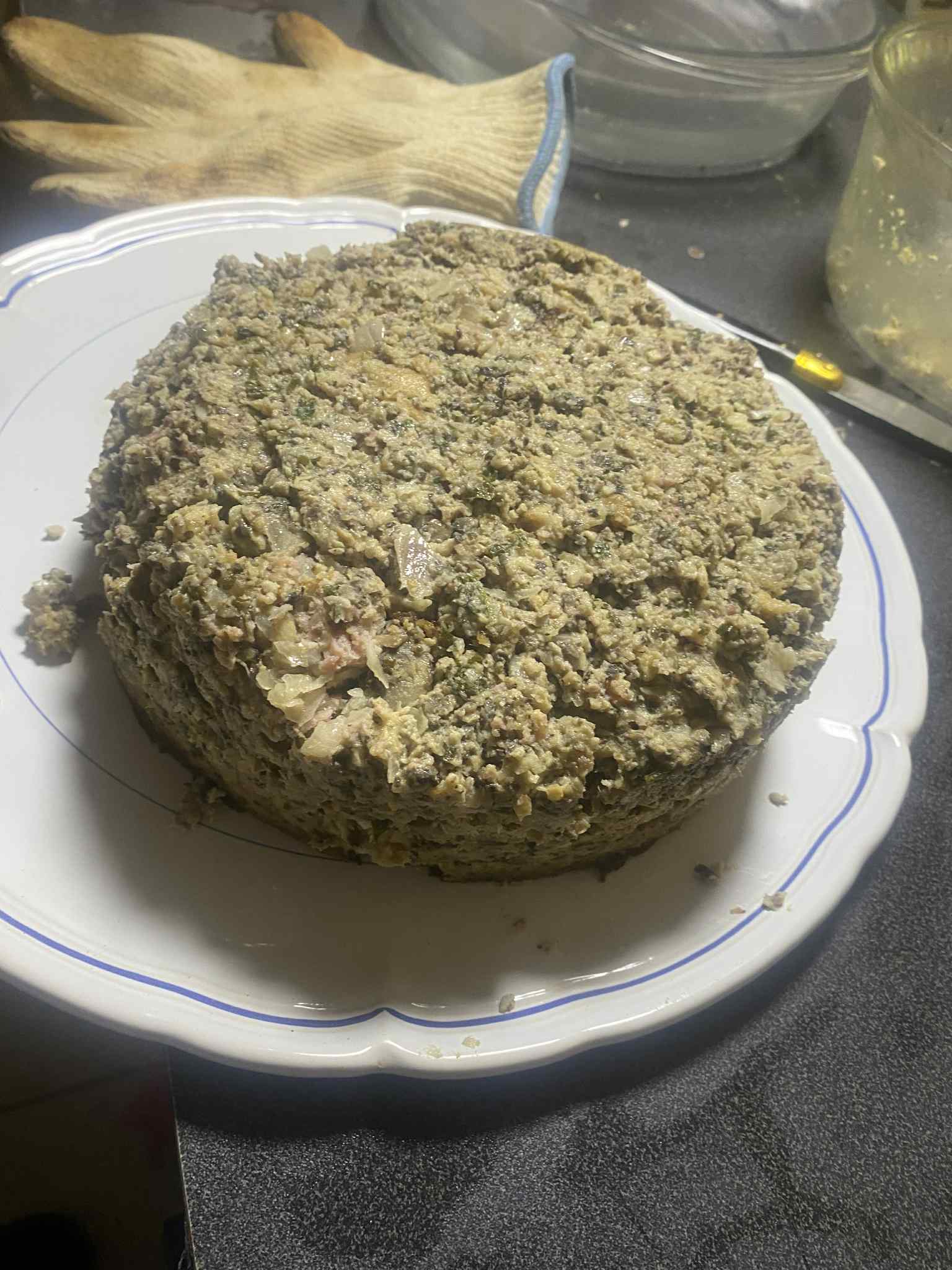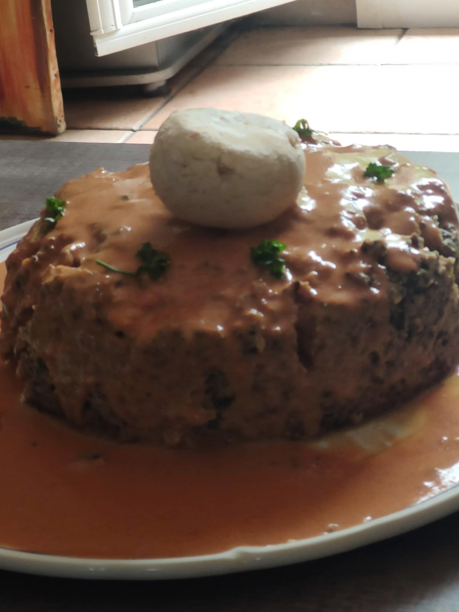 Sortir gâteau du four, démouler (si vous vous lancez, faites gaffe à cette étape, c’est fragile… au pire, comme suggéré plus haut, faites le légèrement surcuire de façon à assécher les bords pour la première tentative) et verser de la sauce pour couvrir le gâteau, garder le reste en saucière (notez que c’est une sauce sympa pour accompagner des trucs du style quenelles de brochet). Mettez quelques brins de persil et/ou des morceaux de champignons crus sur le gâteau… ça décore ![]()