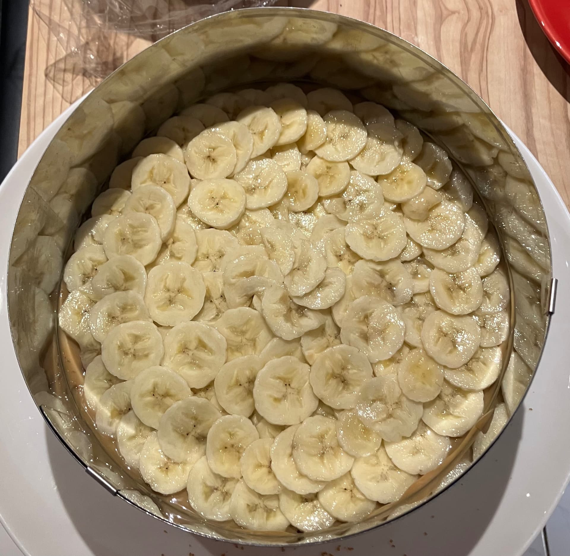 Pour cette fois-ci j’ai dû user de l’entièreté des boîtes de gâteaux et deux bananes car j’avais un très grand cercle, mais selon vos propres ustensiles la quantité des ingrédients biscuits et bananes peuvent varier.