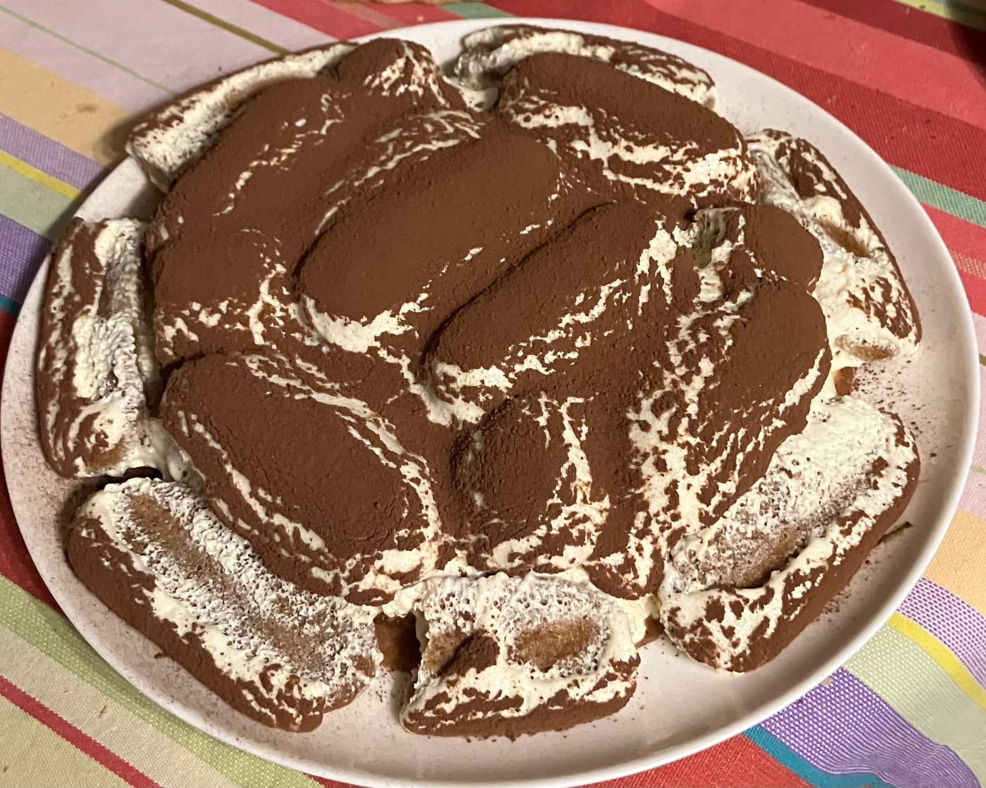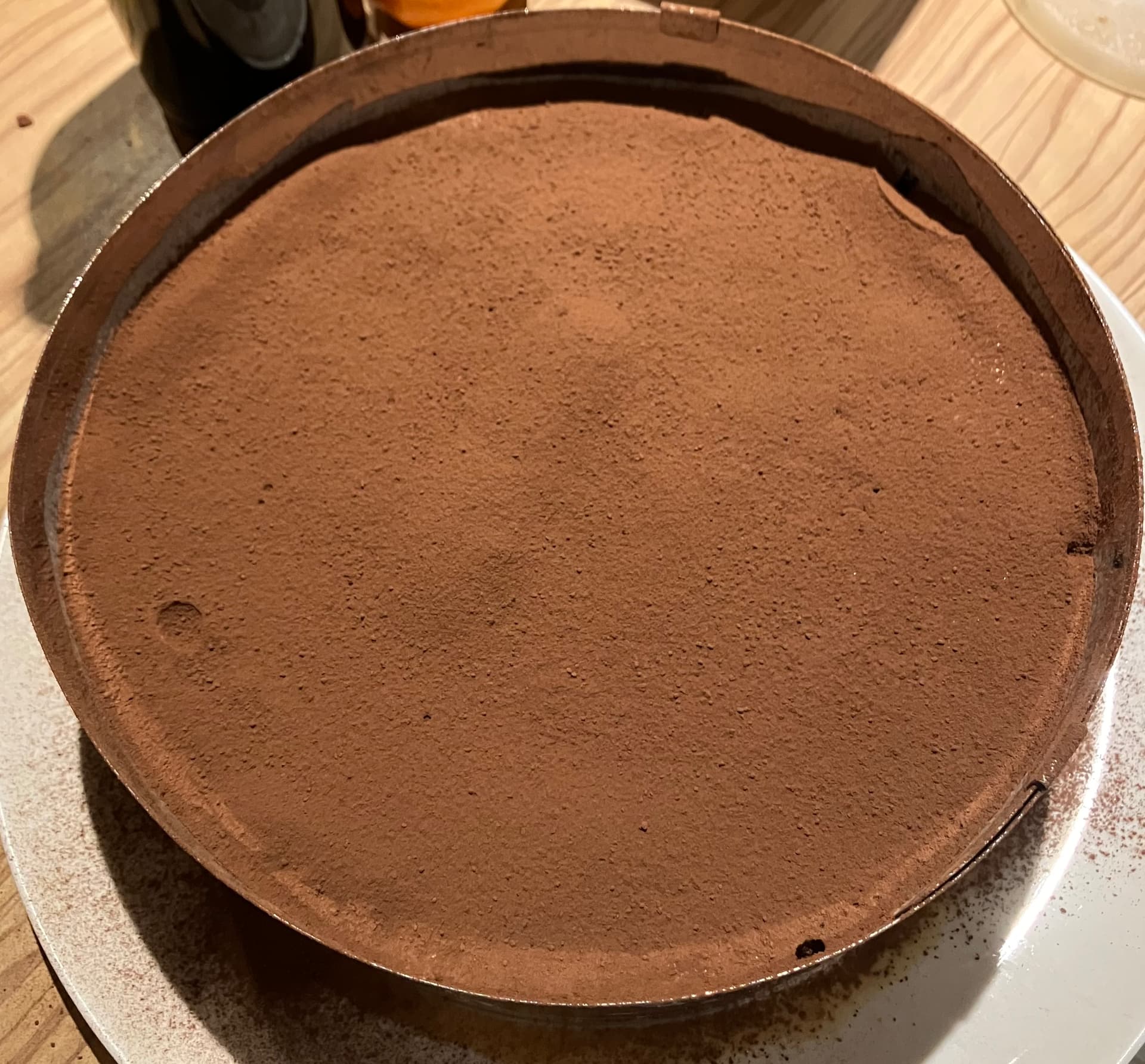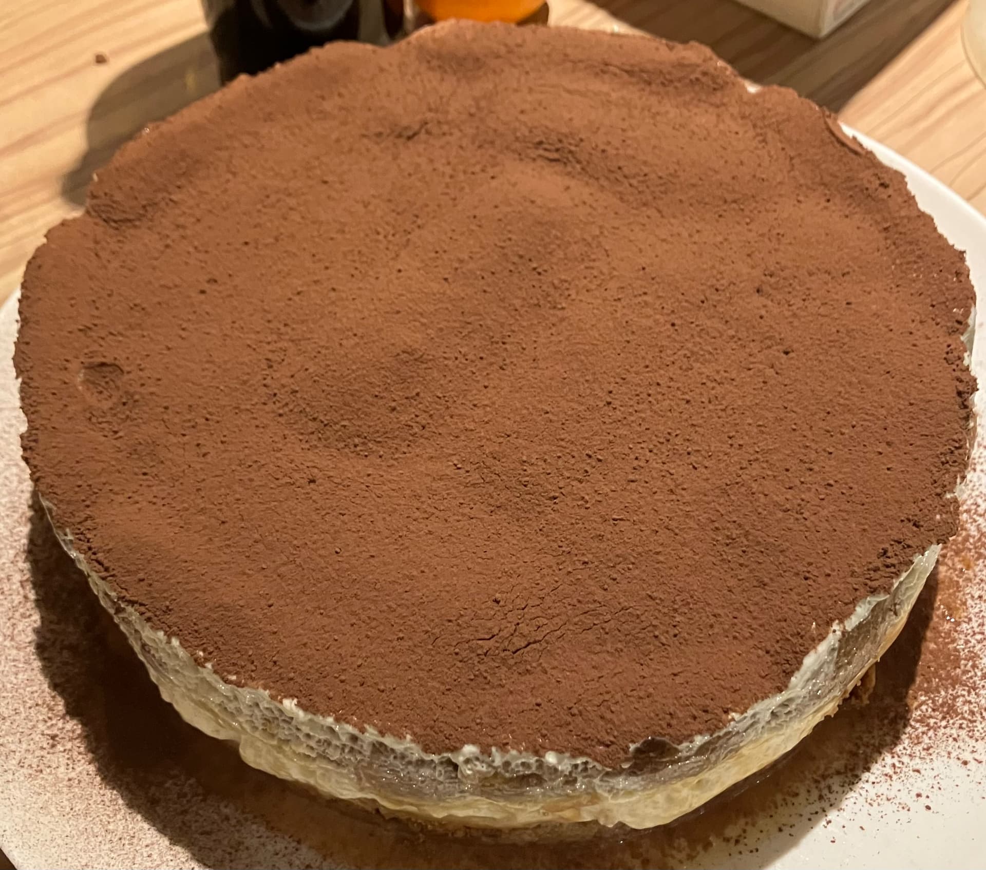 ) sur la surface en essayant de bien recouvrir, et mettez le reste de crème mascarpone. Faites refroidir tout ça au moins 4h pour que ça prenne bien, puis terminez la déco en poudrant de cacao ; vous n’avez plus qu’à démouler ou à servir, selon que vous ayez opérez avec un cercle à pâtisserie ou un moule/plat.