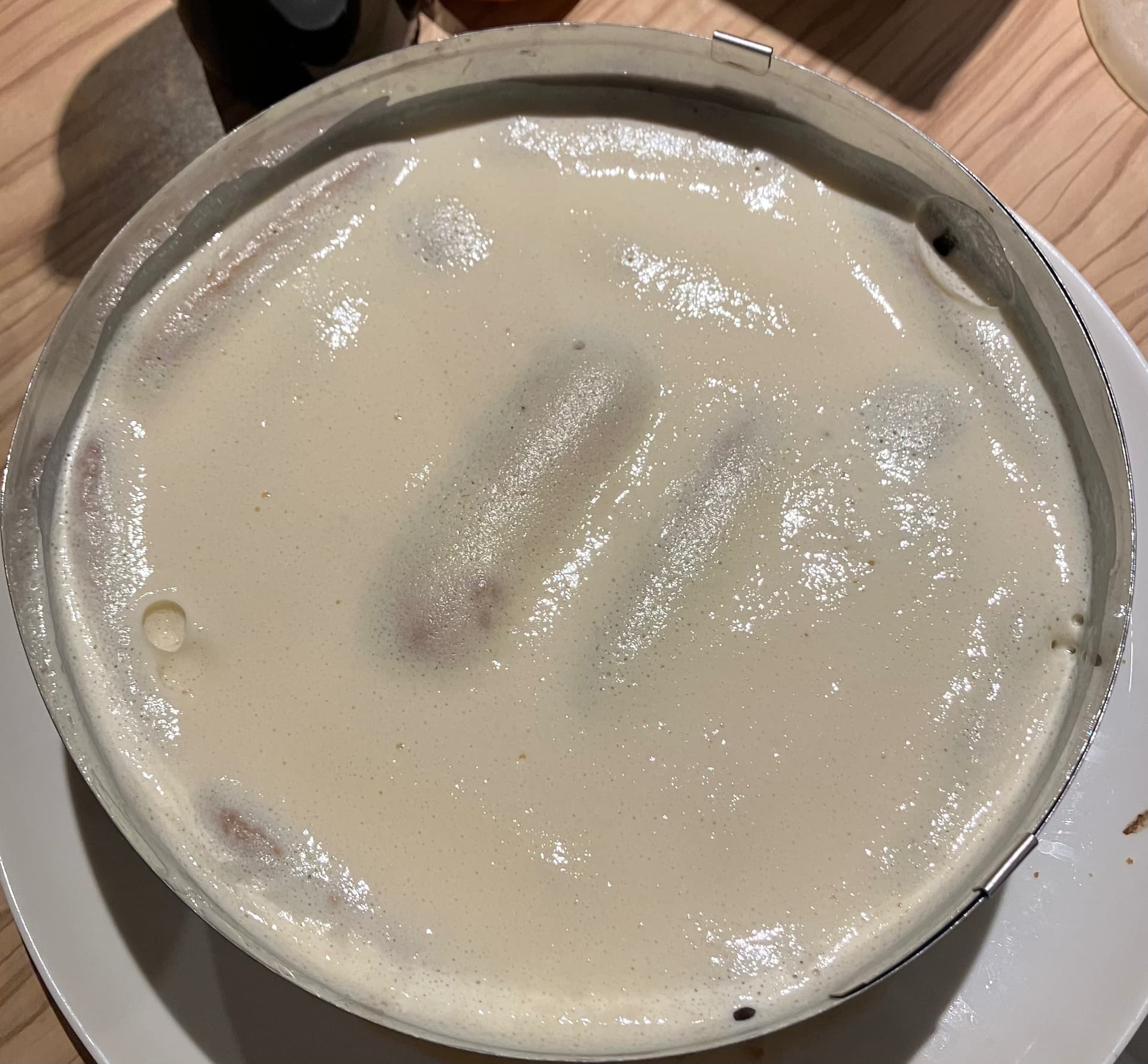 Vous étalez la moitié du mélange mascarpone sur la base banoffee, puis vous mettez les biscuits boudoir trempés dans le café (ou décaf, si vous préférez