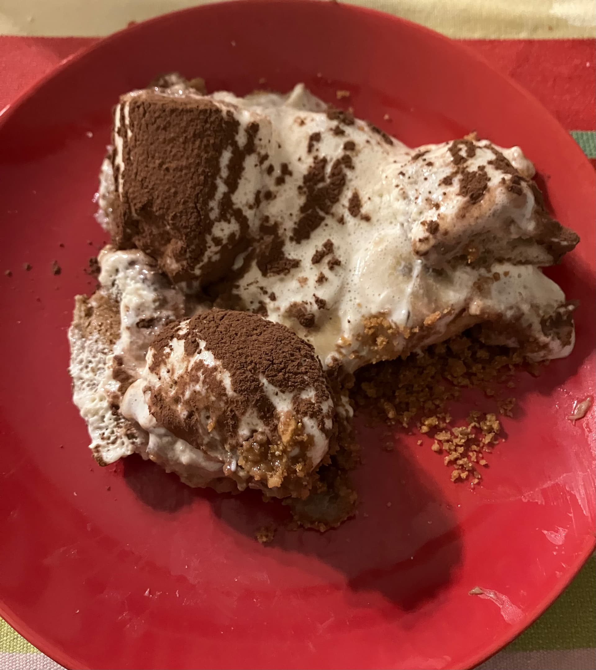 En fait, je pense que la crème tiramisu n’était pas assez ferme de base ou à cause des blancs peut-être pas assez montés, ce qui fait que genre une minute après le démoulage, le gâteau s’est effondré dans le plat, un peu comme une fleur et…