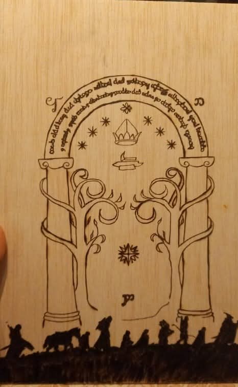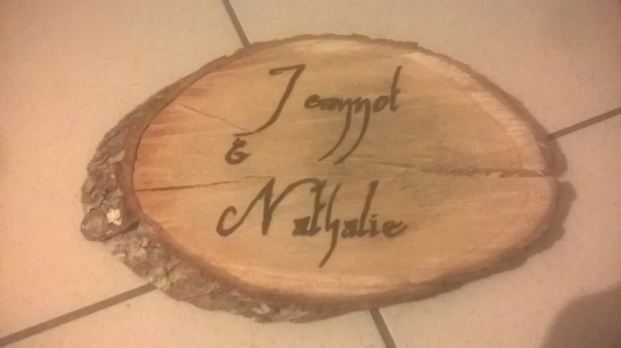 Un dessous de plat, j’ai pas la photo du résultat final, jai rajouter en écriture elfique les deux prénoms sur les côtés, malheureusement elle s’est fendu complètement après quelques mois d’utilisation. C’était un cadeau offert mais autant le bois c’était de la récup autant pyrograver sur un bois rainuré c’est encore plus dur !