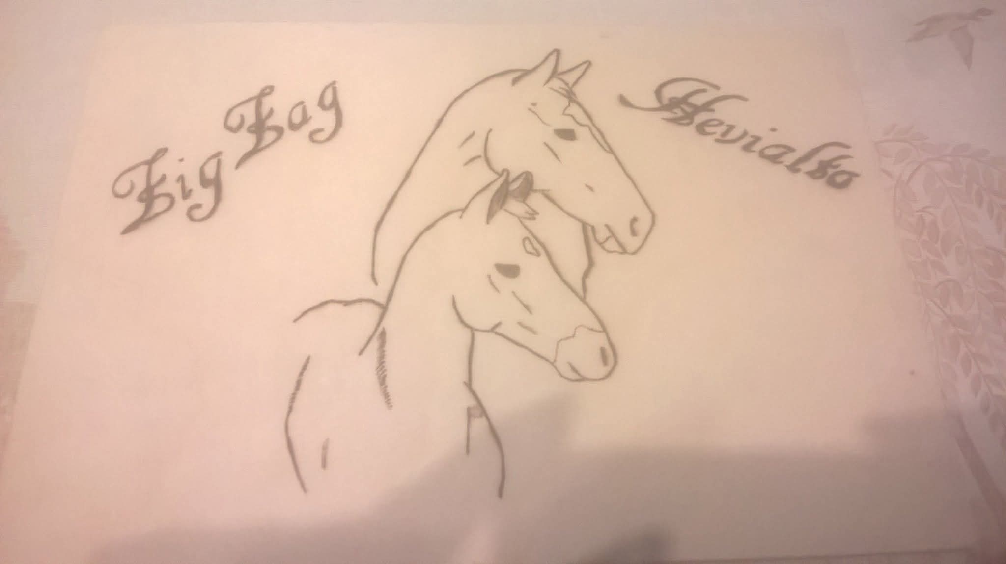 Et pour moi également (mon cheval et mon poulain d’après une photo d’une amie) :