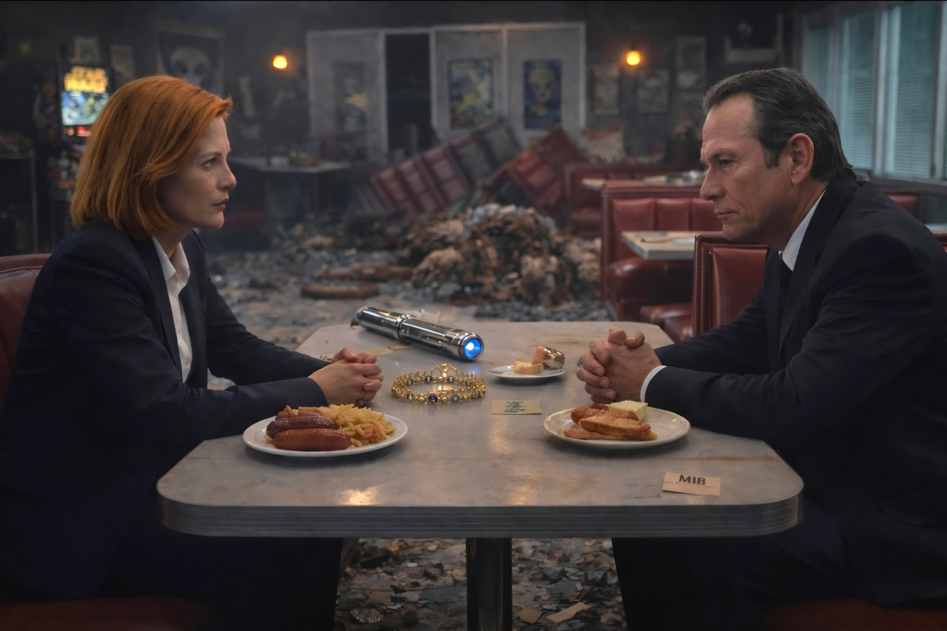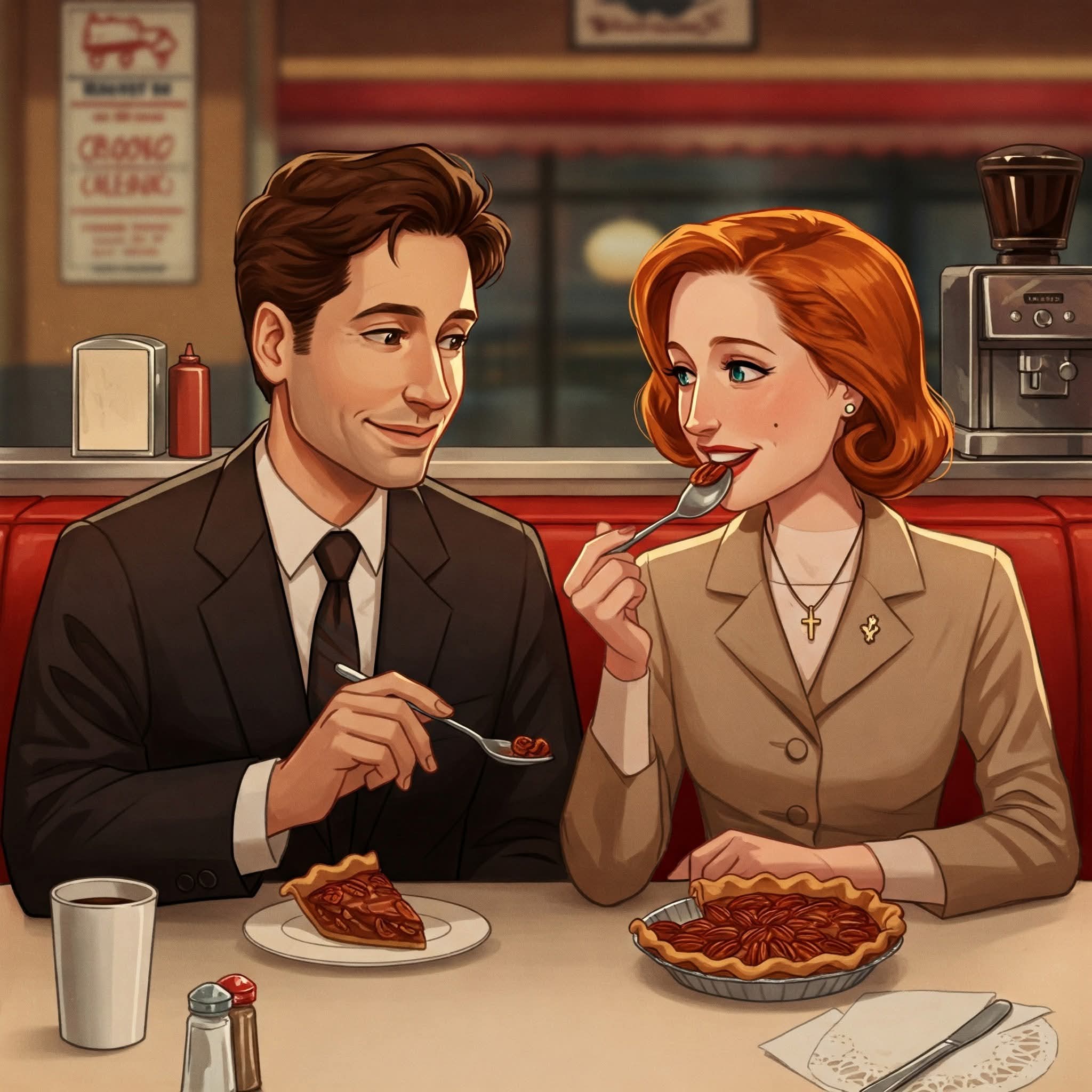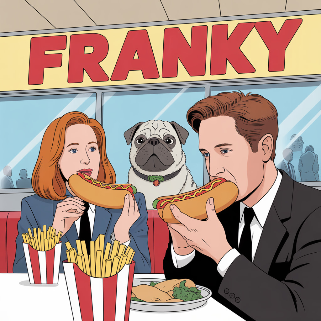 C’est dur d’obtenir des trombines ressemblantes à la fois pour Fox et Dana. Et en voyant la taille des hotdogs (sans doute standard aux USA), on comprend mieux pourquoi Scully peine à boutonner son pantalon au bout de trois jours ![]()